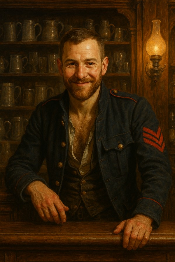 When working behind the bar, he usually wears rolled-up shirtsleeves and a waistcoat. On colder nights, or when the mood strikes him, he throws on his old Royal Navy jacket – open, worn, and heavy with unspoken memories.