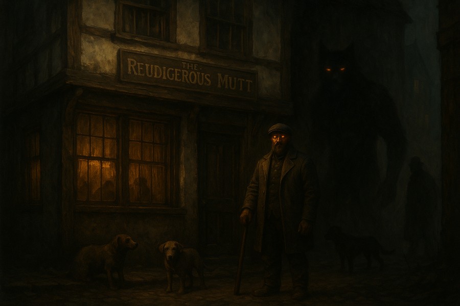 Above the door hangs the sign: The Reudigerous Mutt, hand-painted in uneven lettering on rough wood. A single oil lantern casts a warm, amber glow across the entrance, highlighting the grain of the timber, the ironwork of the hinges, and the worn threshold polished smooth by countless boots. On fog-heavy nights, the light clings to the mist, making the doorway feel less like an entrance and more like an invitation.