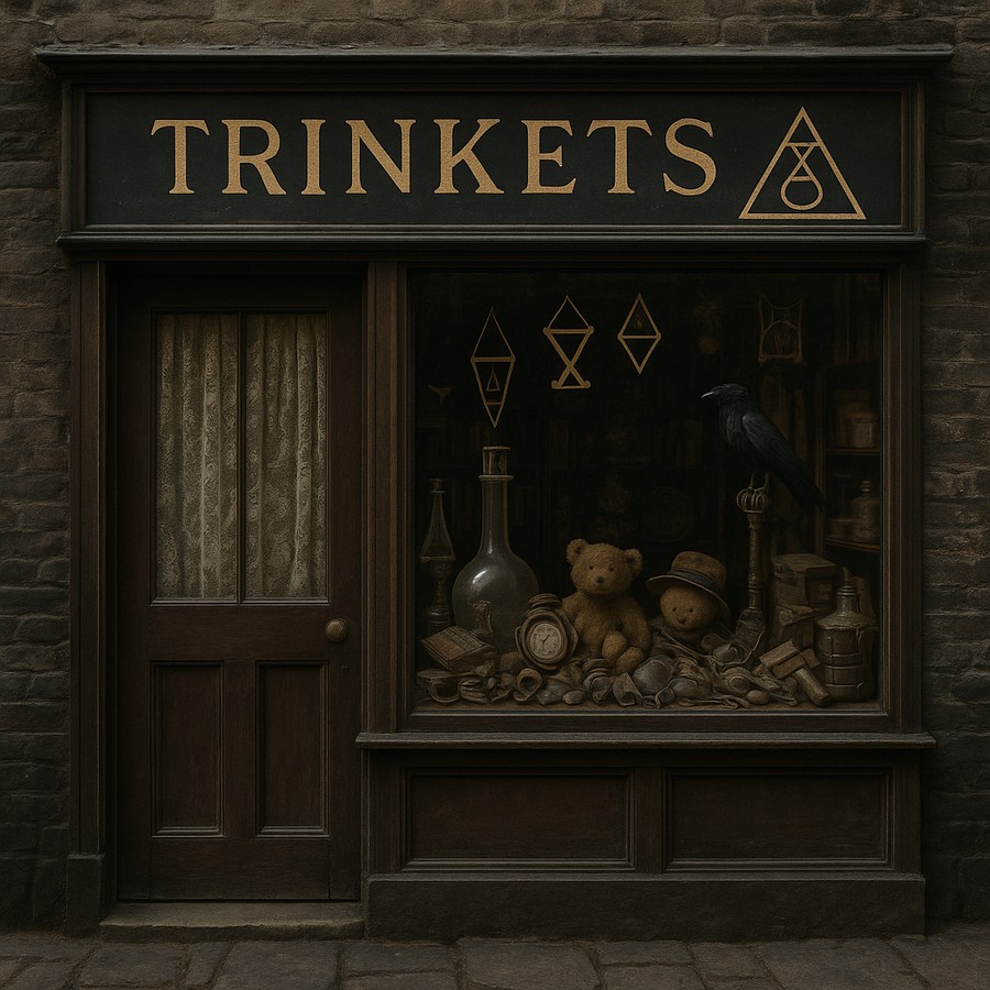 A narrow, dim-lamped shop in Witch's Hollow whose very name is a lie. Trinkets is styled to suggest nothing more than bric-a-brac and curios, a place to rummage for cheap gewgaws. In truth it is an illicit apothecary, owned and operated by the unregistered alchemist Aaron Blight, serving those who prefer their potions quick, quiet, and off the books.