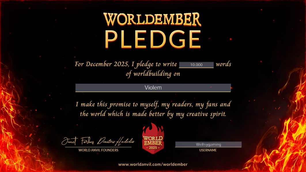 I think this year for WorldEmber I feel like I am going to aim for a lot less than I usually do. Going for the 10k word count and spread across 10 articles. Now because I have been out of it for a while I have completely forgotten what I have in the world of Violem therefore there is no real area of focus. Instead I think I am going to use Worldember as a way to get into the articles that have never quite fitted into any other challenge, topic or just felt like a stand alone thing. Which leads nicely into prep bingo 1...