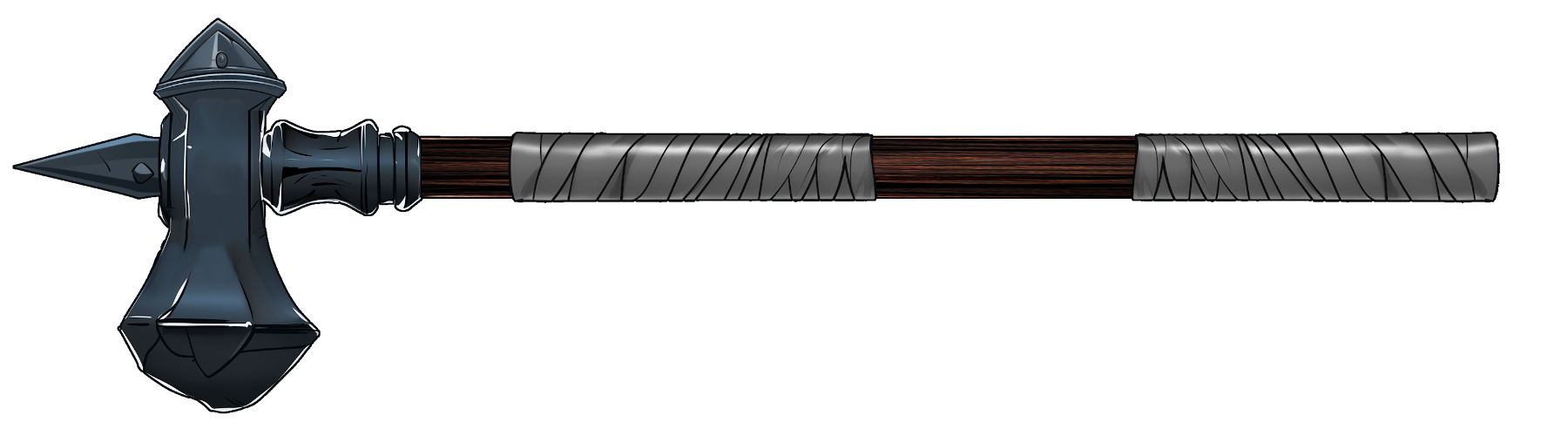 War Hammers feature a dense steel head, either completely flat or slightly pointed, and are meant to bring overhwelming force into a small area. There might be a spike on the other side or another hammer head. These weapons have an overall length of up to 36 inches long and are wielded with one hand, though there are much longer examples that require two hands. Very Effective against plate armor.
