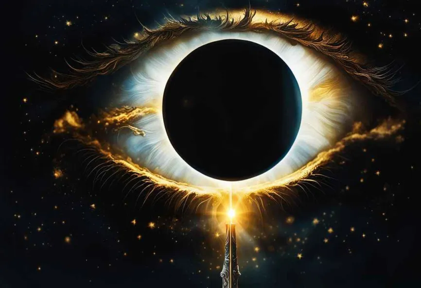 A single eye with a glowing sword inside of a pupil