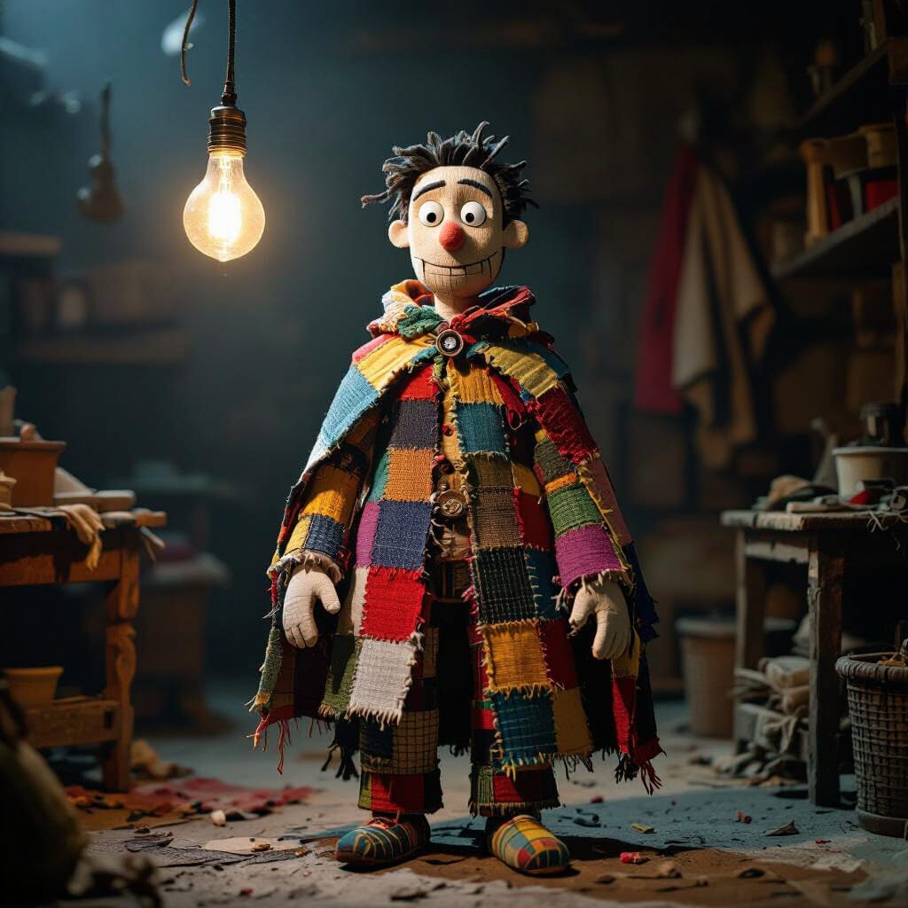 Something stood at the end of the alley, hunched over. Looked like a man wearing ten coats all sewn together by someone drunk. Patches everywhere — red, blue, old quilt pieces, some bits that looked like skin but weren’t. Too smooth. Too clean.