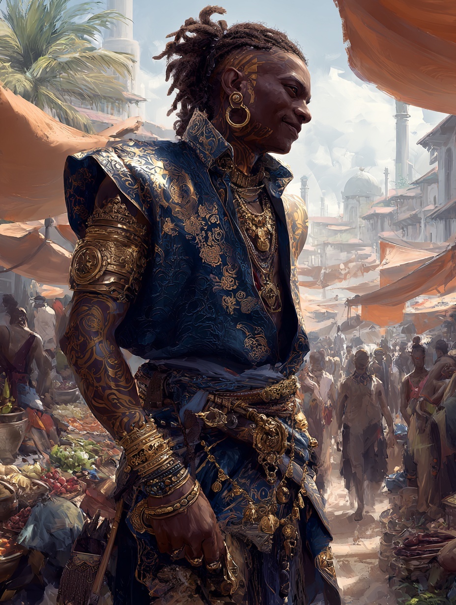 Barozan appears as a tall, dark-skinned figure draped in embroidered robes of copper and indigo, laden with golden jewelry and etched tattoos that shimmer and shift like ink in water. His eyes gleam like polished obsidian, and his voice is smooth as poured honey. His dreadlocks are bound in golden rings, and his grin is both kind and cunning.Symbol