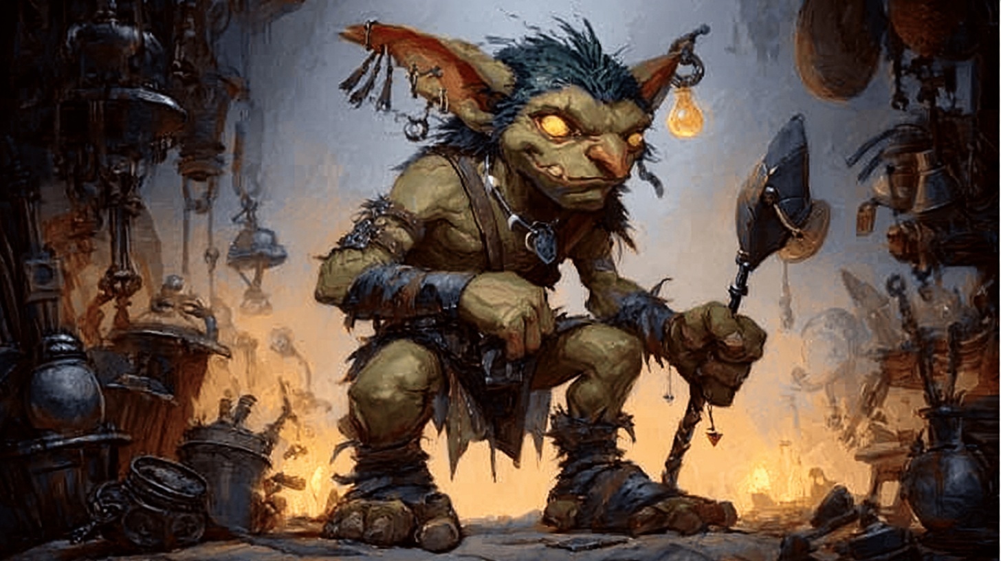 Goblins are small, wiry humanoids with oversized ears, long fingers, and glowing yellow or green eyes. Skin tones vary from mossy green to burnt ochre or rust brown. Many decorate themselves with stolen trinkets, strange gadgets, or charms crafted from bone, glass, and junk.Culture and Society
