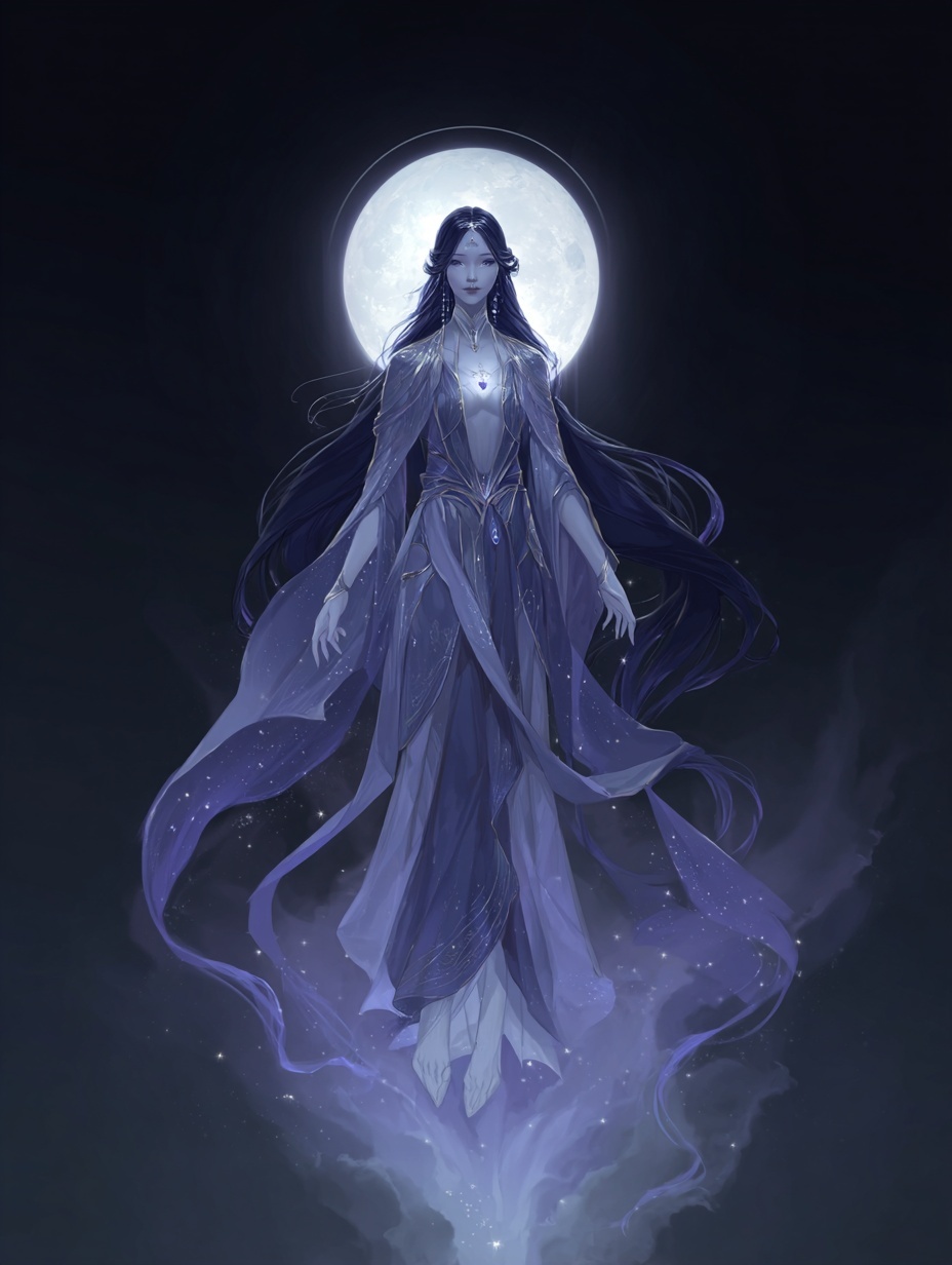 Lunara is depicted as an ethereal figure with silver-lilac skin and eyes like pools of starlight. Her flowing robes shimmer with lunar radiance, and her presence brings stillness, like a hush before revelation. Her hair falls like moonlight and trails behind her like mist.