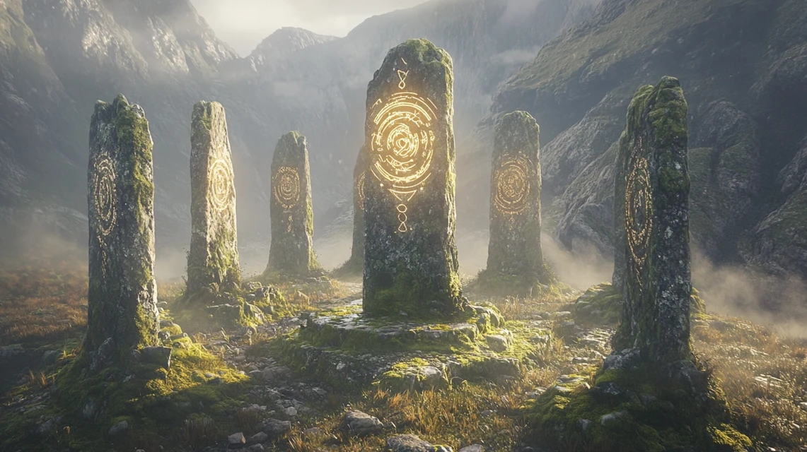 The Memory Chisel: A single artisan’s chisel bound with leather cord, representing the act of preserving a soul’s echo.Standing Stones: Upright grave markers with runic names, often arranged in spiral or circle patterns.