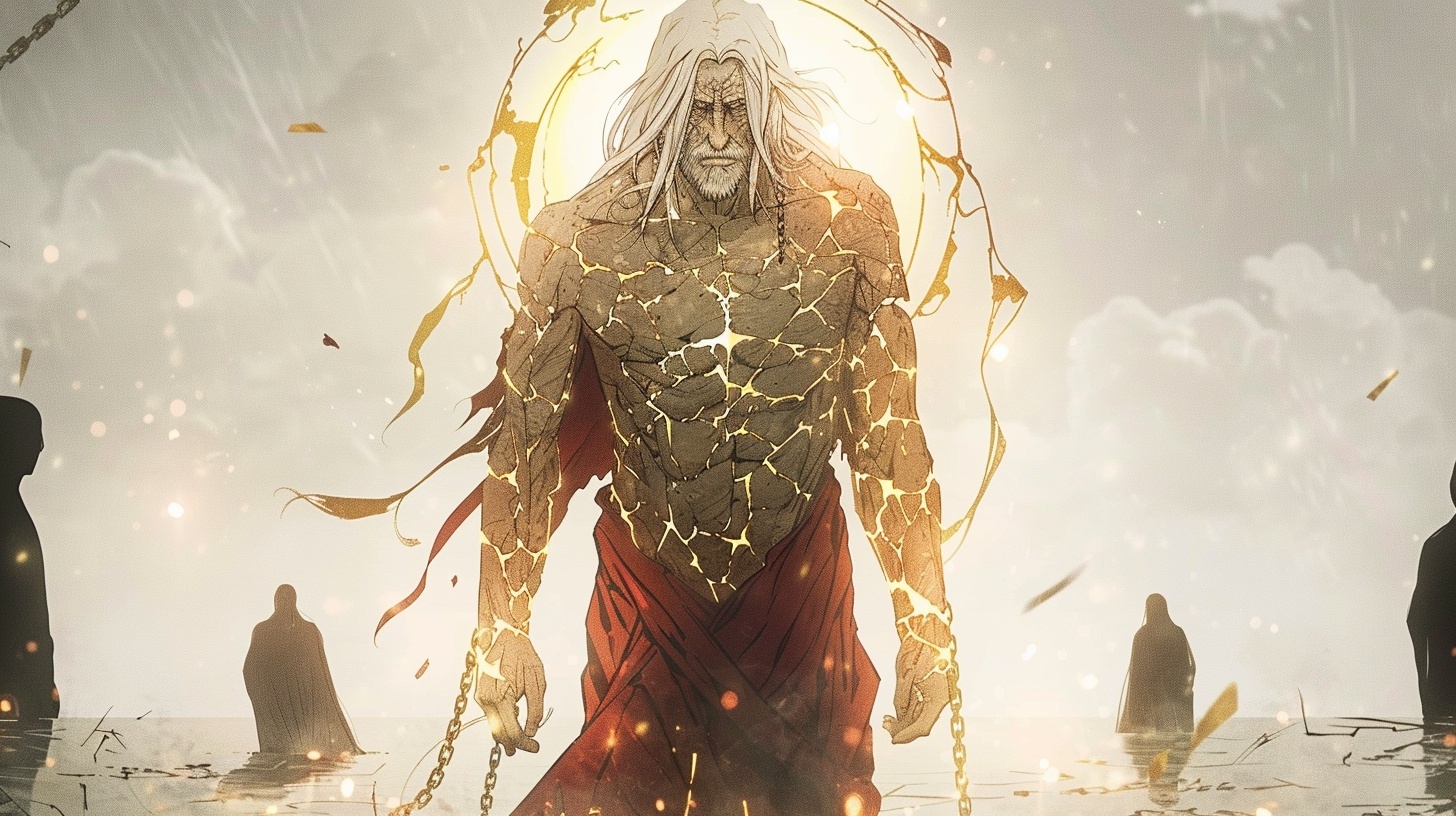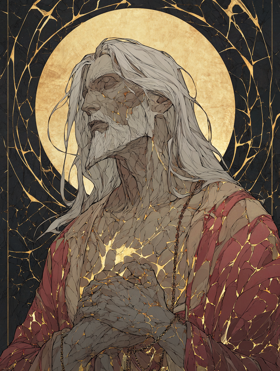 The Vessel Unbroken: His form is cracked — like porcelain or stone — glowing with gentle golden light from within. He is broken, but never shattered. This myth symbolizes that mercy often comes at cost, but is never weakness.
