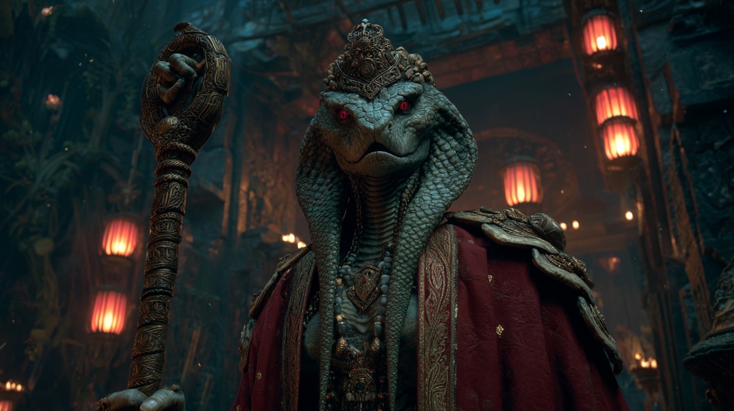 Appearance: Seraphith Sauraki are serpentine humanoids with elongated heads, slit-pupiled eyes, and crown-like hood structures that vary in color and shape — some vibrant and ornate, others dark and imposing. Their scales range from deep emerald, black, and crimson hues in the jungle-born to dusty tan and pale ash tones among the desert-dwellers. Their long tails and graceful frames mark them as agile and precise.