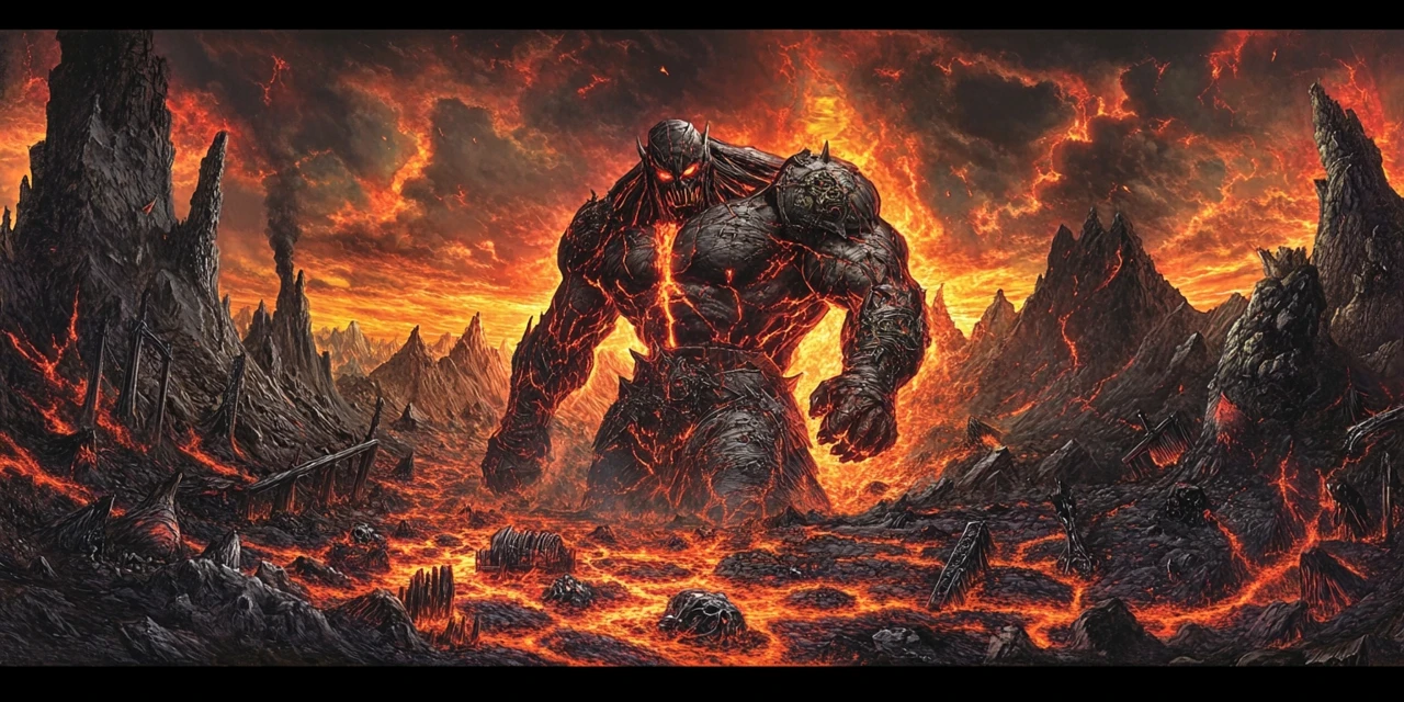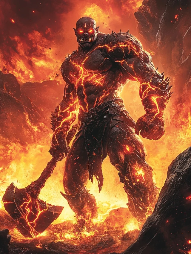 Sinbog is depicted as a towering orc clad in spiked blackened steel armor, adorned with scars that glow faintly with molten fire. His skin is a deep crimson, and his tusks are etched with runes of conquest. His weapon, Bloodfang, is a colossal axe that drips with the blood of unworthy foes. His piercing ember eyes burn with the intensity of an eternal flame.