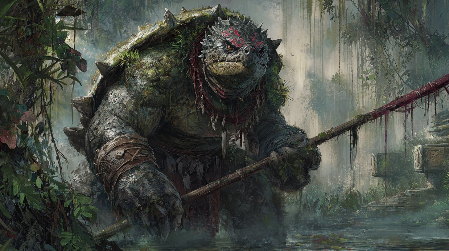 Snapmaw culture is built on dominance and survival. Clans form in twisted wetlands, often moving on giant lily pads, root-islands, or reclusive ruins. Strength is respected, but so is cunning. Trials of pain, beast-hunts, and blood duels determine leadership. Their tales are carved into bark or spoken in growls — never written. Trust is rare, but loyalty once earned is unbreakable.Faith and Beliefs