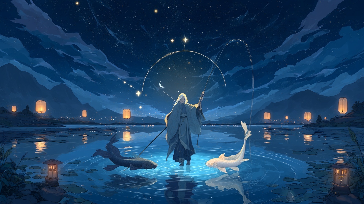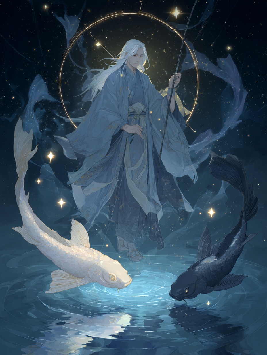 The Celestial Pond: Legends tell that Tenyari was the first to gaze into the night sky and see not chaos, but reflection. He dipped his rod into the heavens and drew forth the first threads of fate — luminous and shifting, shaped not by law or prophecy, but by balance.The Eternal Koi: Tenyari is never depicted alone. He is accompanied by two mythical koi — one white, one black — who circle one another in perfect harmony. These celestial fish are eternal companions, embodiments of duality: calm and passion, action and restraint, past and future. It is whispered that their bond sustains the balance of the world.