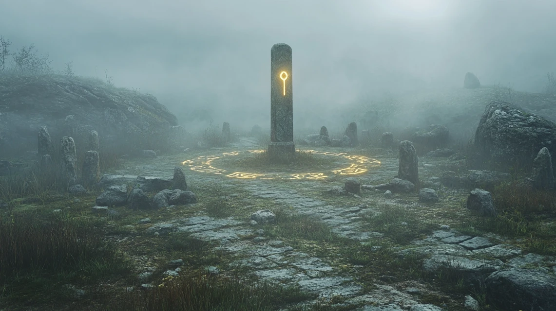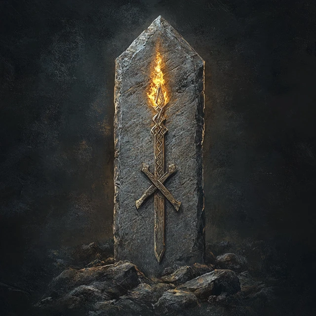 A chisel over a standing stone, often crowned with a faint carved flame. It may be etched into lanterns, worn as a pendant by gravekeepers, or painted in ash on sacred stones.Mythology & Lore