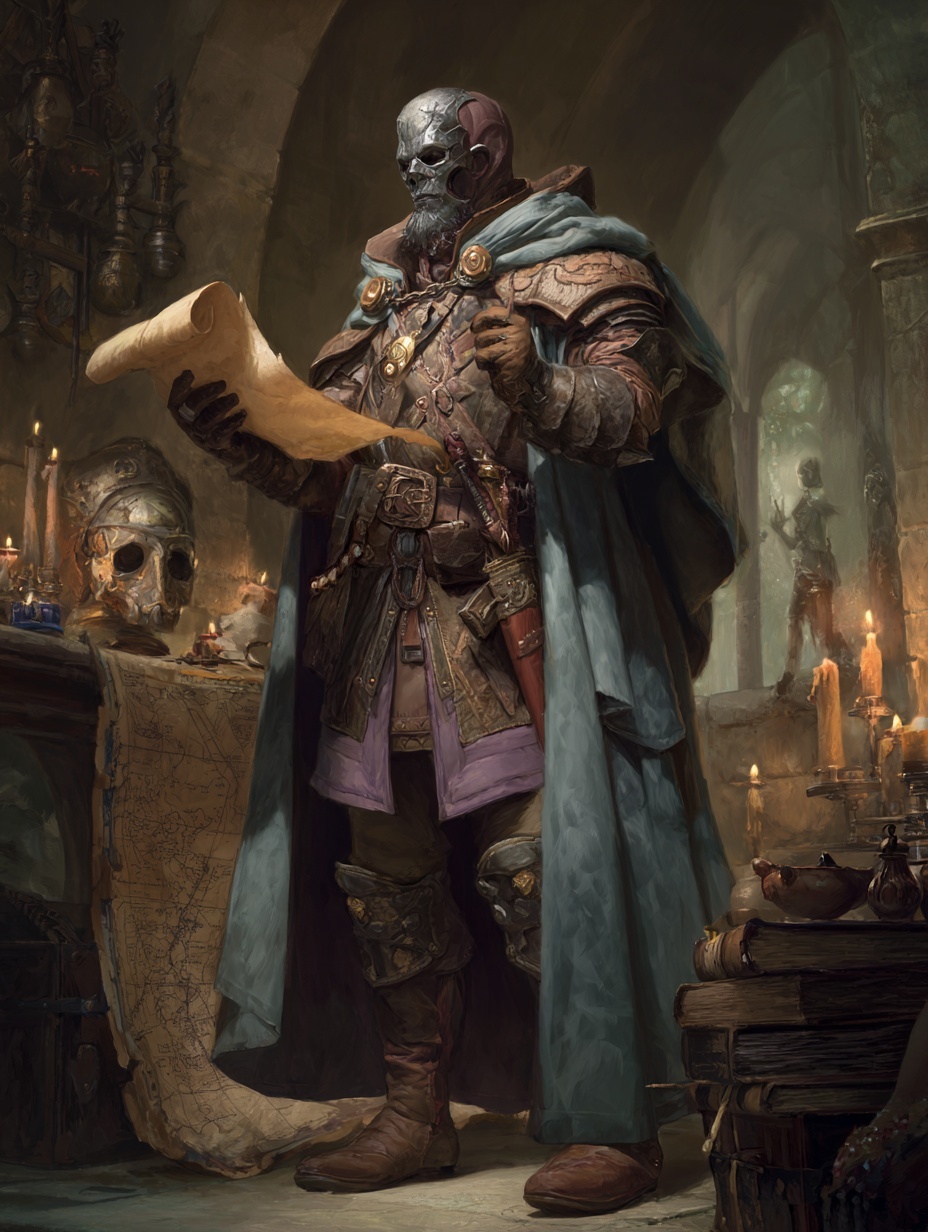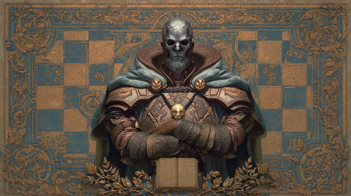 Velkhar appears as a tall, lean man clad in regal bronze and slate-grey robes, his face partially masked in polished steel. His eyes are like twin chessboards — layered with ever-shifting patterns. One hand often holds a scepter tipped with a miniature fortress; the other, a scroll sealed with wax.Symbol