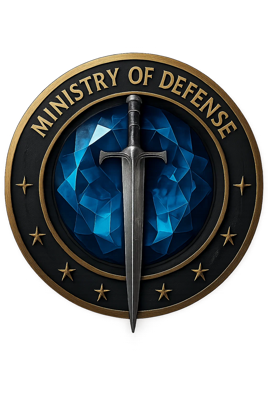 The Ministry of Defense (MoD), formally established under the Imperial Charter of Unity in 0 AFE, was created to consolidate all strategic and inter-realm defense functions beneath a single ministerial authority serving the Sapphire Throne. The name “Defense” was deliberately chosen to reflect the Empire’s philosophy of preservation rather than aggression; as all known realms fall within imperial boundaries, the Ministry’s mandate concerns internal stability, not external warfare. Though early drafts of the Charter referred to it as the “Ministry of War and Security,” the designation was rejected by the Sapphire Assembly for implying external conflict. The title Ministry of Defense was adopted instead to symbolize the Empire’s stance that there exist no foreign powers, only the duty to safeguard its own peace and cohesion.Organizational Structure