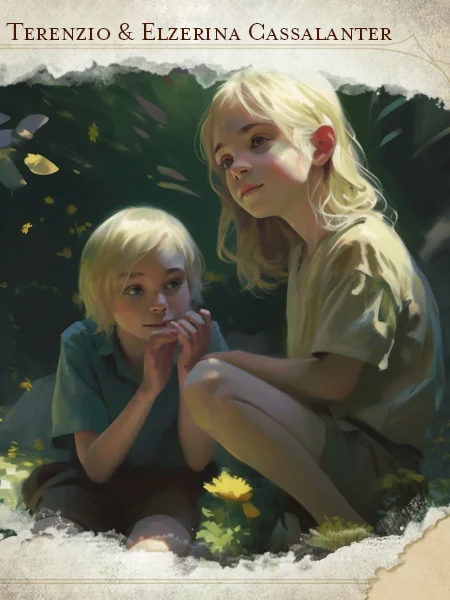 The Cassalanter twins aren't members of their parents' cult and have no other friends, since they are privately tutored and rarely allowed to leave the estate. Around strangers, Terenzio becomes suspicious and meek, while Elzerina seems brash and outgoing. Both children are incredibly excited to meet friendly strangers and treat their "new friends" to a trip around the house. They help the characters sneak through the villa, since the children know they aren't supposed to have guests.