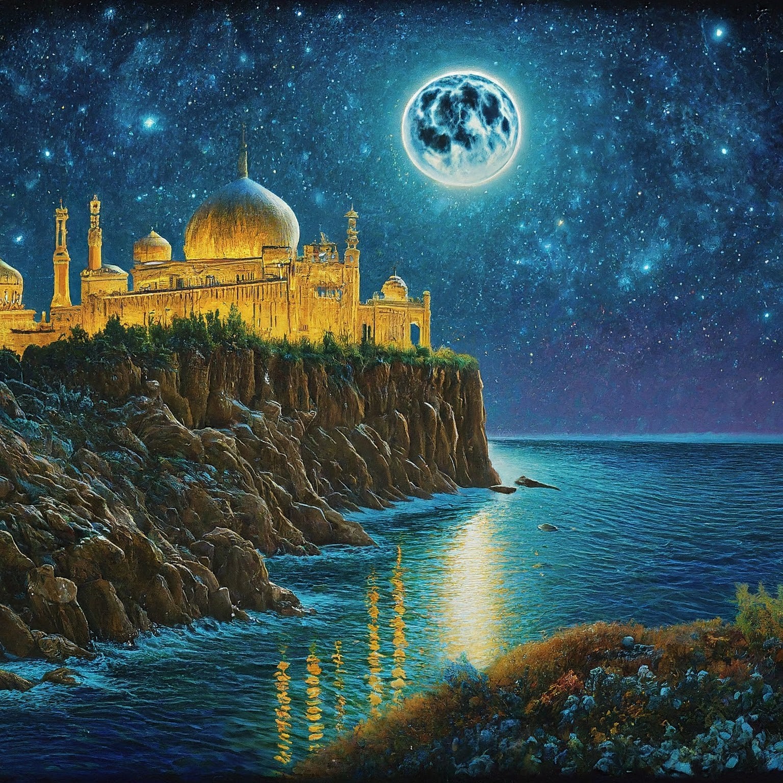 A Silver Mirror fantasy created by the Fae for Pluto, this Persian inspired golden fantasyland is full of incense, belly dancers, slaves, pillows, and even a demonblood mutated cat. Resting on a cliff facing the open sea on a moonlit night this is a fantasy for classical tastes.