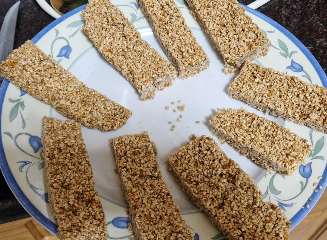 Next step is pouring the mixture onto a parchment-lined tray or a greased plate and flattening it with a spoon or spatula, then you allow the whole thing to cool for about 15–20 minutes at room temperature. Once cooled, cut it into small rectangular bars or bite-sized squares, and... you have some nice Sesame Honey Bars that will sweeten your already tough days of marches, camping, and fighting.