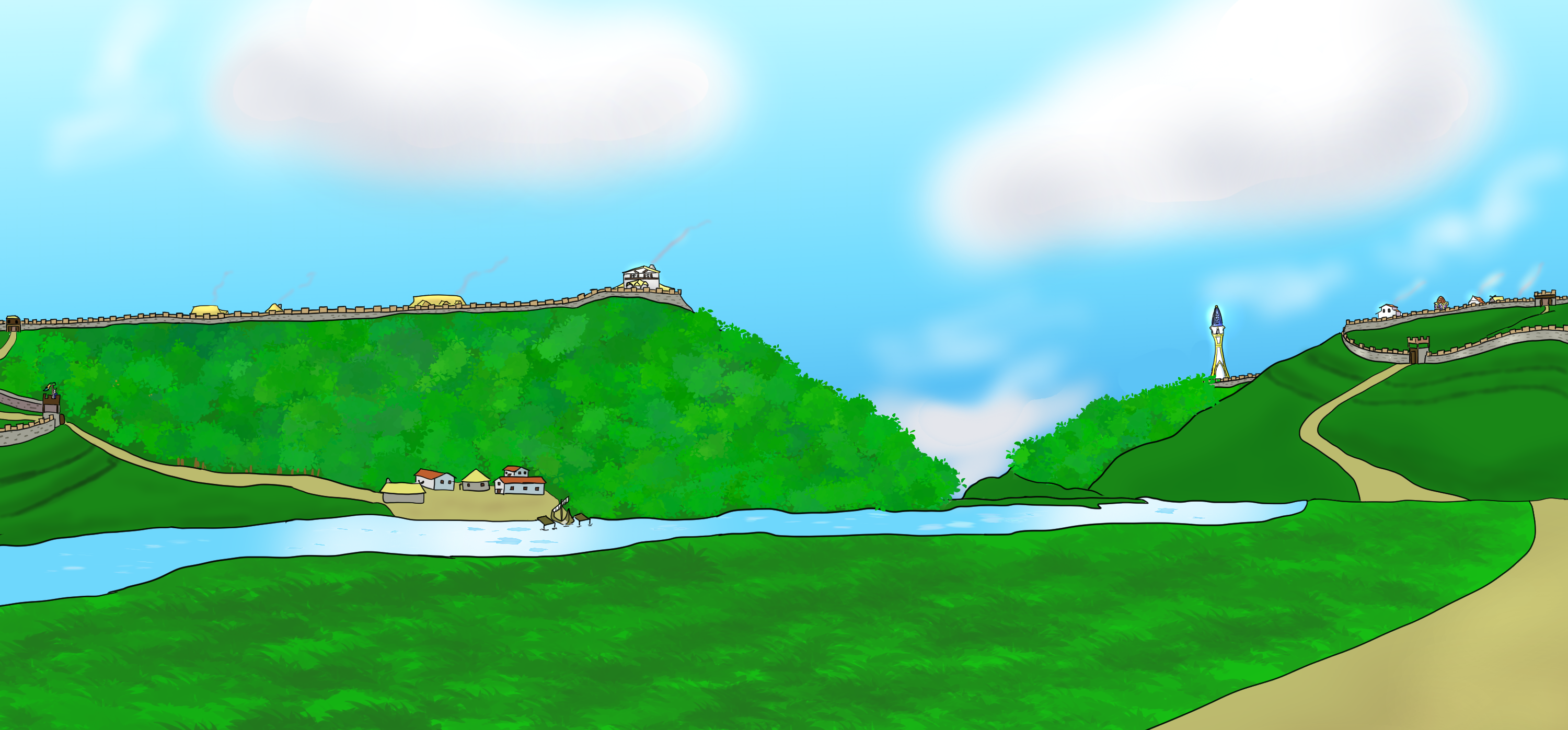 Deva and Lyndyn are located in the South-East of the Kingdom of the Snow Elves, where the winters are not as harsh as in the north of the country. Both settlements are located at the mouth of the river Andyn (one of the most beautiful places in Teria as many travellers say), close to the frontier with the Kingdom of Cloudia in two hills on opposite banks of the river, thus their name, the twin cities, These two settlements dominate the nearby Andyn valley that lies between the coast and the so called Griffon's nest, the easternmost part of the Albine Mountains. Their location makes them very difficult settlements to besiege, as each of them are protected by two layers of strong, stone walls and multiple ditches. Deva is located on the western hill, the highest and the steepest of the two promontories, while Lyndyn is located in the smallest yet widest of both hills. In the middle of both mountains lies the mouth of the river Andyn which allowed both settlements to build small docks where fishing and trade ships could dock or take refuge from storms due to its sheltered location. Their strategic position is key for their prosperity because they are close to the main trading routes across the Northern Sea as well as close to other important "permanent" and cave settlements of the Snow Elves such as Issinnonara, Enmesha or Cayr Adrynor and Cayr Thillanar and the border with the Blatians of Cloudia, the Kingdom of the Snow Elves' most important trade partner and ally. Being also two of the four permanent settlements that the Snow Elves inhabit through the whole year means that their economy is less dependent on magic or even on an Artificial Sun, though as the locals say : We don' get to see a lot of the actual Sun during most of the winter, since it is raining or cloudy most of the time, and only in autumn, part of spring and summer do we have weeks where we don't see a single cloud.Layout