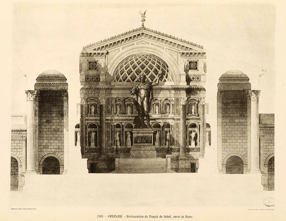 To Abbon Shabai, father of gods and humans, light of wisdom and goodness, protector of the just, Tiberius, Emperor of the Ikarians, in the third year of his reign, together with the Senate of Ikaria, dedicated this altarThe pediment of the temple was decorated initially just with a medallion showing the portrait of the god wearing a radiate crown, but a new sculptural cycle was added around the 190s BP which represented the heavenly court with Abbon Shabai in the centre seated on his throne accompanied by Tyr and his sons interceding for the destiny of humanity. The interior of the temple had a golden roof as well as a marble floors and walls made of porphyry. It had a rectangular shape as well as other typical Ikarian temples with an apse and the end of the building where the famous statue of the God of Wisdom and the Sun was located. This was a chryselephantine statue over 13 meters high and when light came through the windows (a distinctive feature of this temple unlike other Ikarian temples) it made people believe that the statue was glowing, like if they were transported to the Heavenly palace of the gods. The apse had little niches where statues of the other gods as well as deified Emperors were placed. In front of the statue there was a marble altar were the priests, the Emperor and the common people made libations or burned incense to honour the deities.