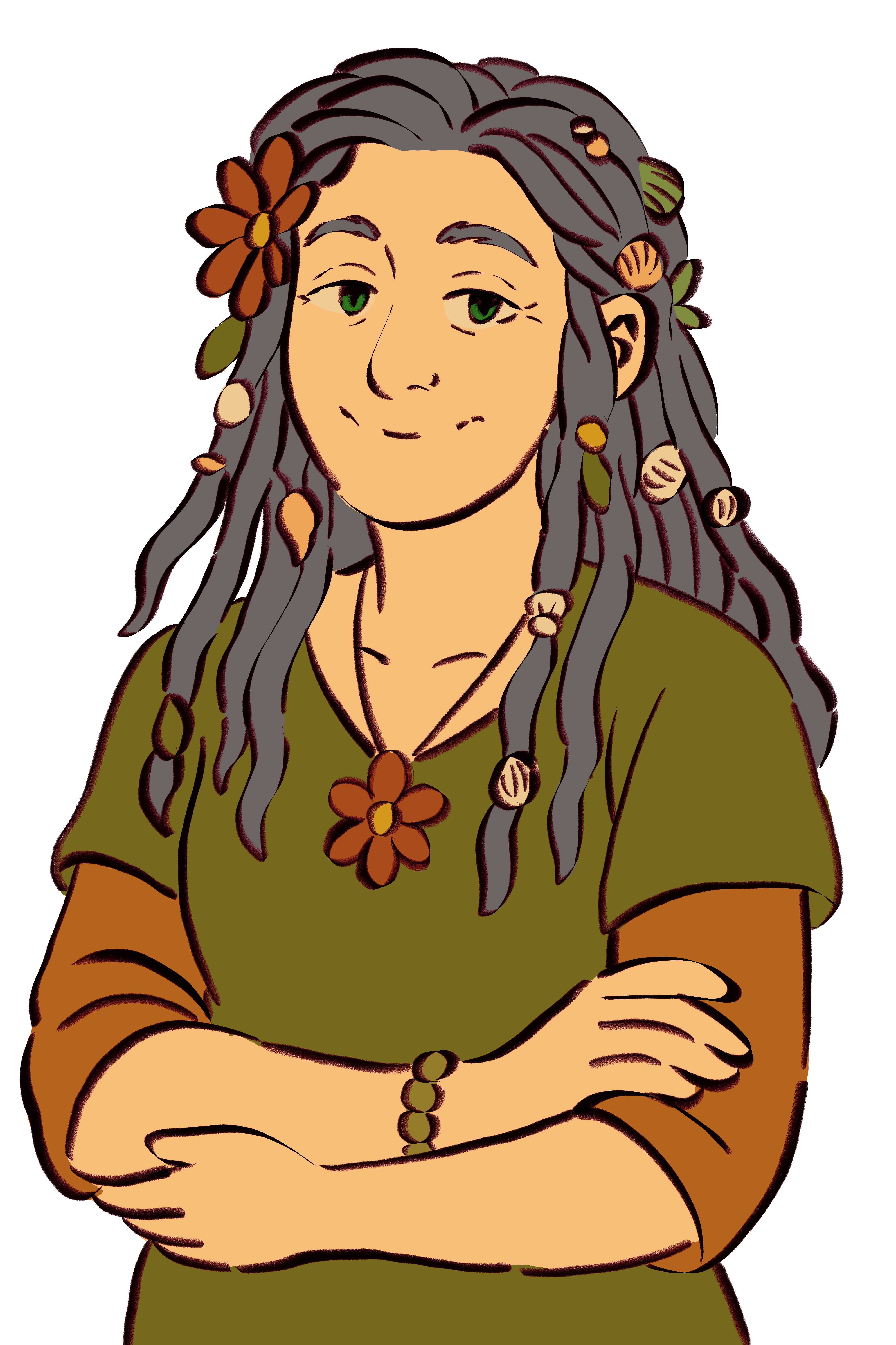 Calfae Brillish, 5’5” and all beads, bangles, and sea-salt curls, runs Potion by the Ocean in Pyzel Harbour’s Little Sister’s Market. Equal parts healer, gossip, and stubborn fixture of the docks, she claims every bottle in her shop has “a tide in it somewhere.” Whether you leave with a cure, a curse, or just a story depends entirely on her mood — and the moon.