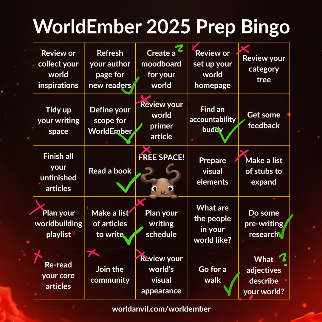 This is the current state of my Bingo card. Some things are X-ed out - for example, I've been in the Discord since 2018, checking that off would feel like cheating, especially since I'm not doing the row/column thing. Since I made Yvari into an event world, the categories come from which event I participated in and there's no world primer or core articles. Since I just did the revamp, there ar eno strubs left, and I decided not to put any schedule pressure on myself.