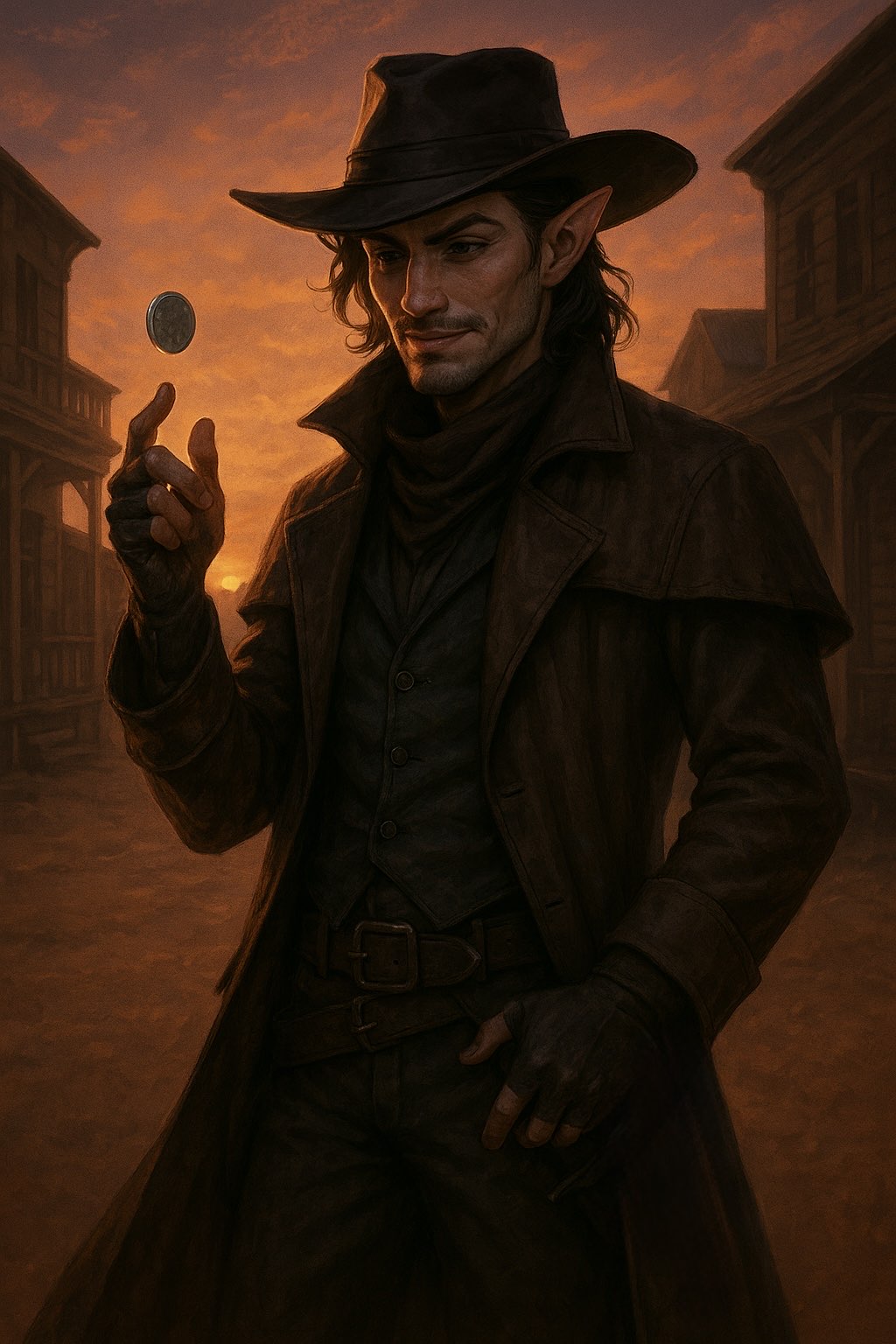 When the smoke cleared at Oathbreaker Gate, Calder wasn’t among the heroes—they don’t hand medals to cutpurses and cardsharps. But Calder followed the war’s wake east, slipping into Dogtown with the first waves of refugees. Claims to be a former scout, though no one's seen him hold a rifle straight. Truth is, he’s running—from Falinorian debts, a double-crossed crew, and maybe even something darker he lifted from a dying magus in the Voidlands: a strange coin that whispers in dreams. Now, he plays nice. Deals cards in the saloon. Picks locks for settlers who lose their keys. But come dusk, he walks the edge of town, eyes sharp for voices on the wind—and fingers twitching for a spark of magic he barely understands.
