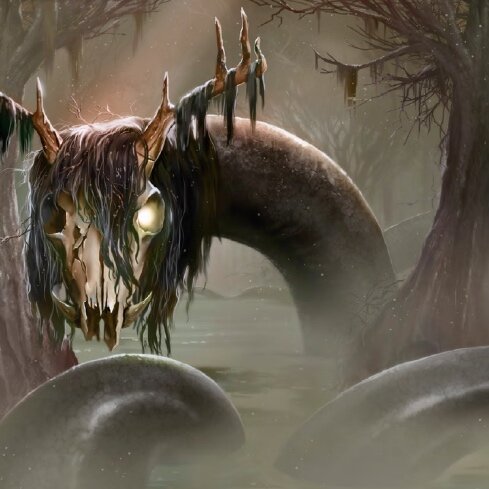 The swamp itself seems to rise up, pulling swathes of the hungry dead beneath the surface. A titanic serpent rises up and cuts off the approach of the undead. Its half-rotted skull, 20 feet long, snaps its teeth down upon the front line of the horde, and as it devours the dead it locks one enormous, milky white eye on the squad.