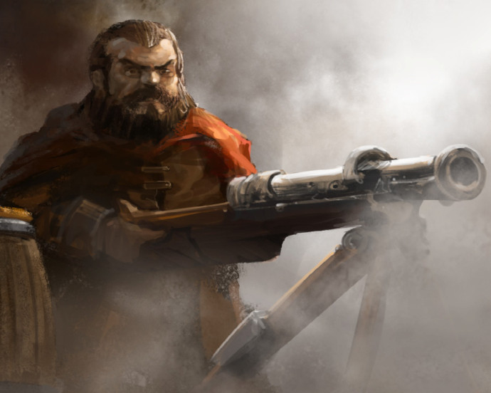 is a powerful muzzle-loading, two-handed, short-range firearm.