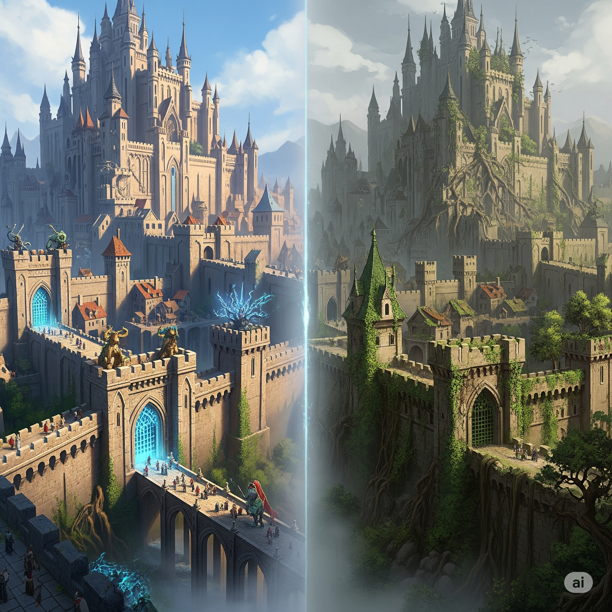 - Erődítmények: hatalmas falak, tornyok és őrszemek védték a várost – Luneth legbiztonságosabb pontja volt.
