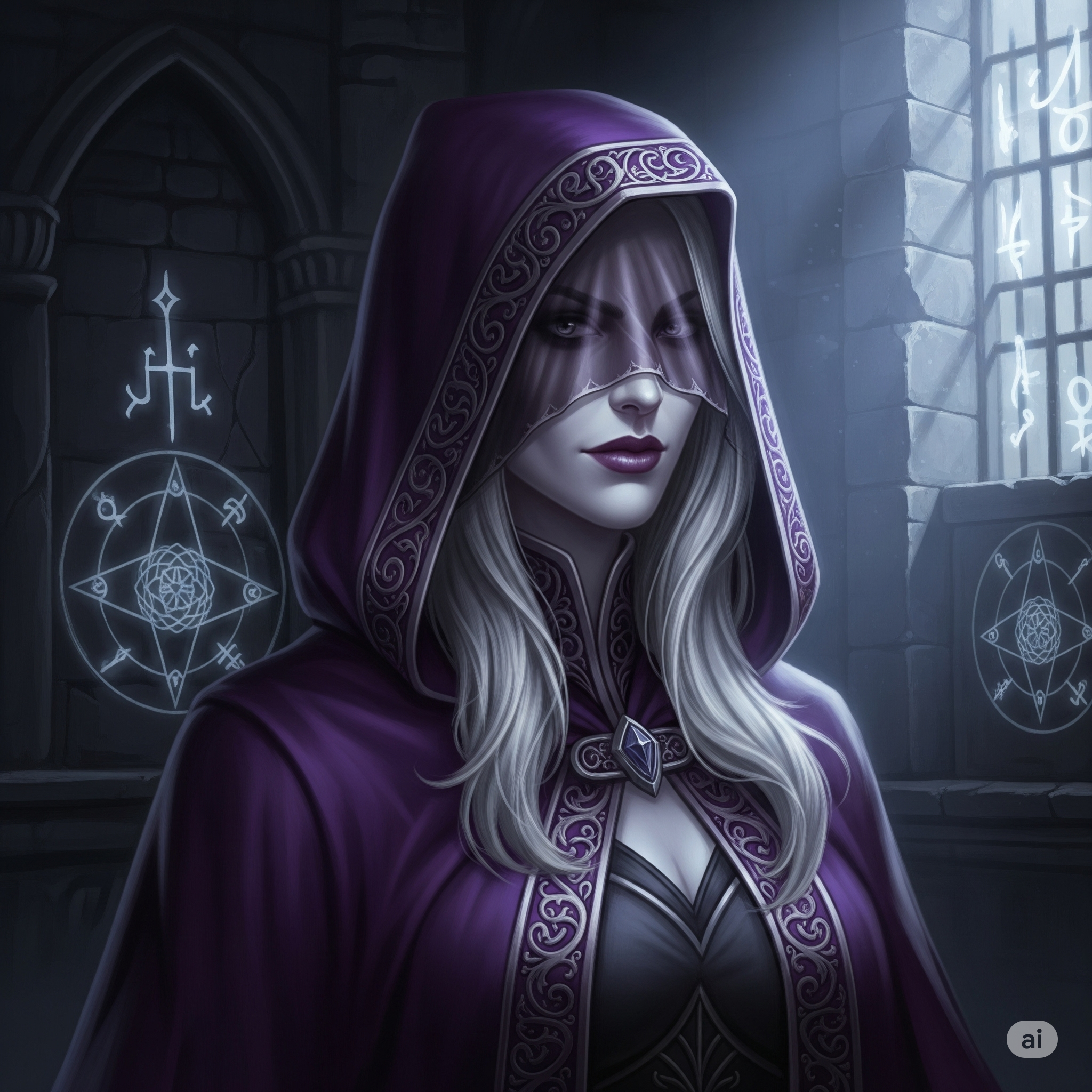 - Kinézet: Hófehér bőr, ezüstös haj, sötétlila köpeny, arcát gyakran fátyol fedi