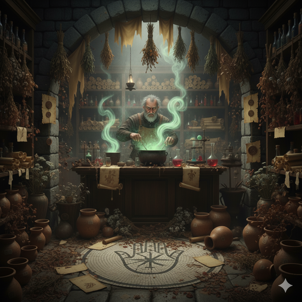A bolt egy alacsony, boltíves bejáraton keresztül érhető el, amelyet szárított növények és kopott függöny takarnak. Belépve a levegő sűrű, mintha gőzben úszna minden. A falakat polcok borítják, rajtuk agyagcsészék, üvegfiolák és viaszos tekercsek. A padlón egy régi, repedezett mozaik látható, amely egy gyógyító kezet ábrázol — de az ujjak hiányosak. A pult mögött Rothan dolgozik, mindig morogva, mindig egy új keveréken.