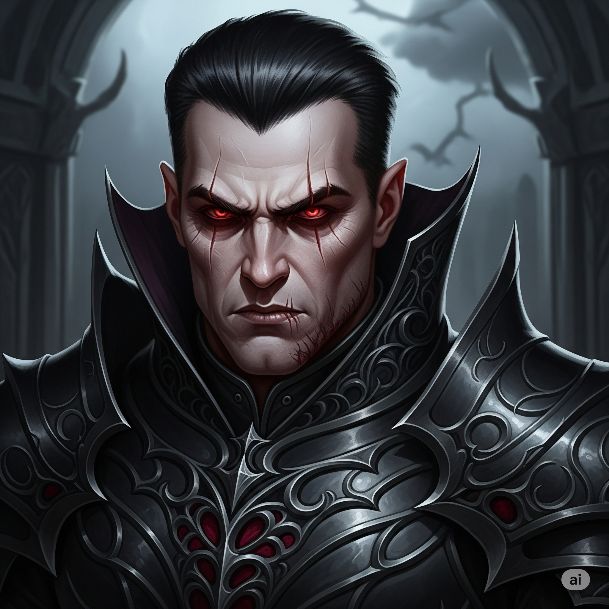 - Kinézet: Fekete páncél, vörös szemek, arcán régi harci sebek