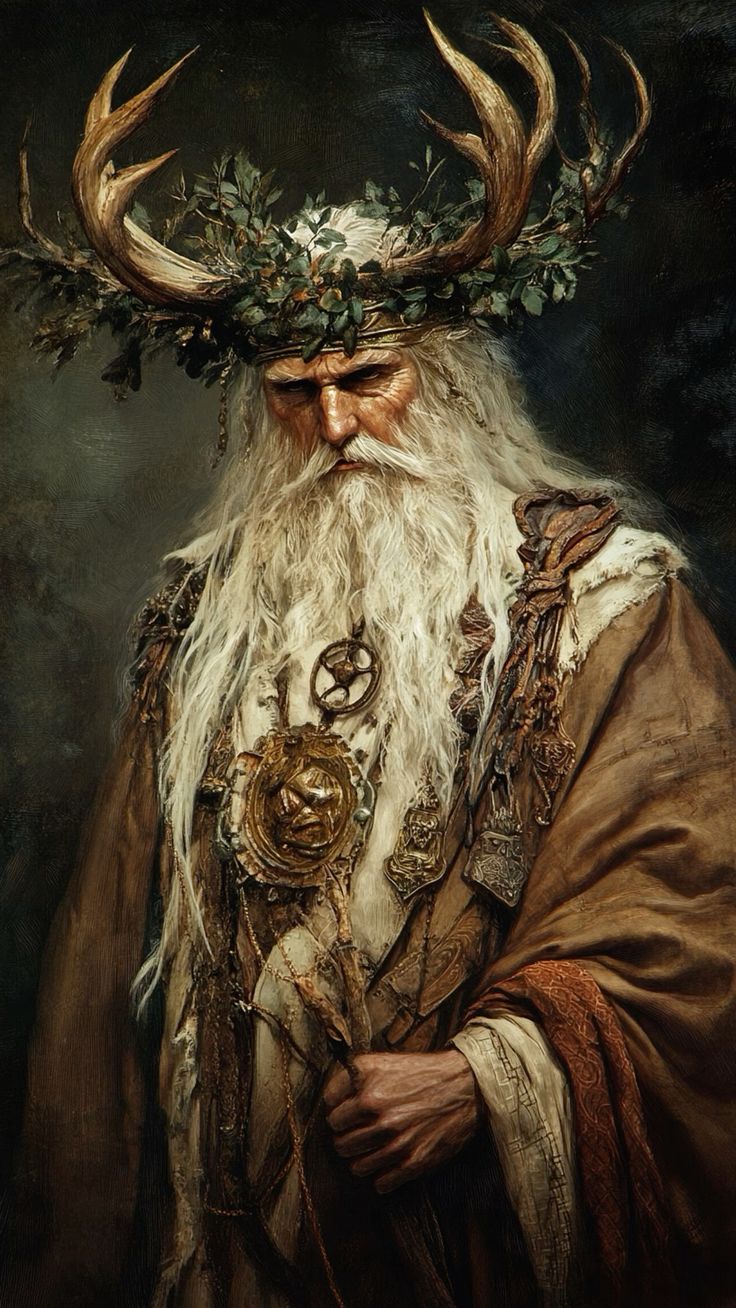 Tiefliegende Augen horizontale gerade Augenbrauen, vom Bart überwachsener Mund und Kinn.Hirschgeweih, mit Nadelästchen behangen