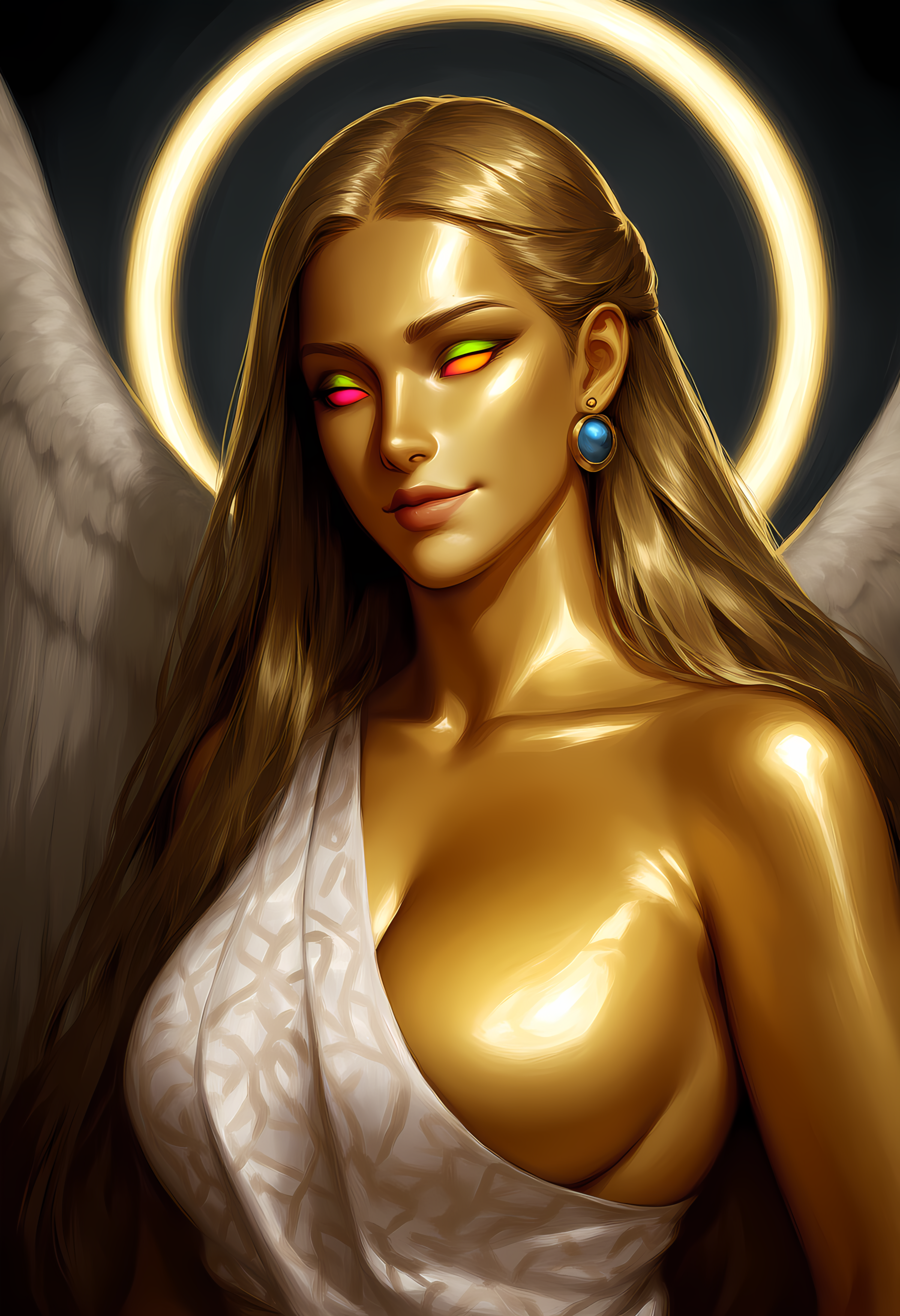Azaliah, like many Celestials, is utterly unmistakable when she reveals her true form - with skin that shines with a metallic golden sheen, eyes akin to solid pits of swirling rainbow light, and six beautiful metallic golden wings that leak contrails of holy light alongside her gorgeous earrings and white-gold armor add up to give her an incredibly unmistakable appearance.